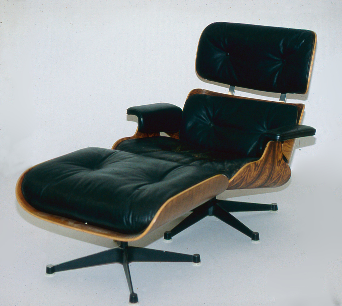 Vilfåtölj och fotpall med stomme av skiktlimmat formpressat trä med ytfanér av jakaranda. Svartbehandlat metallunderrede. Sits och ryggdynor av skumgummi, överstoppat med dun och klädda med svart läder.