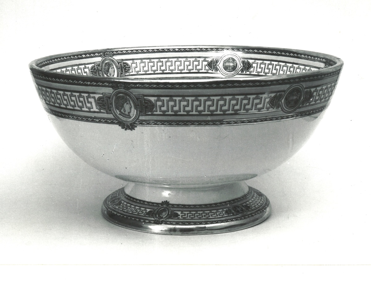 Bålskål i flintgods. Dekor av meanderbård med medaljonger med omväxlande urnor och kvinnoprofiler.