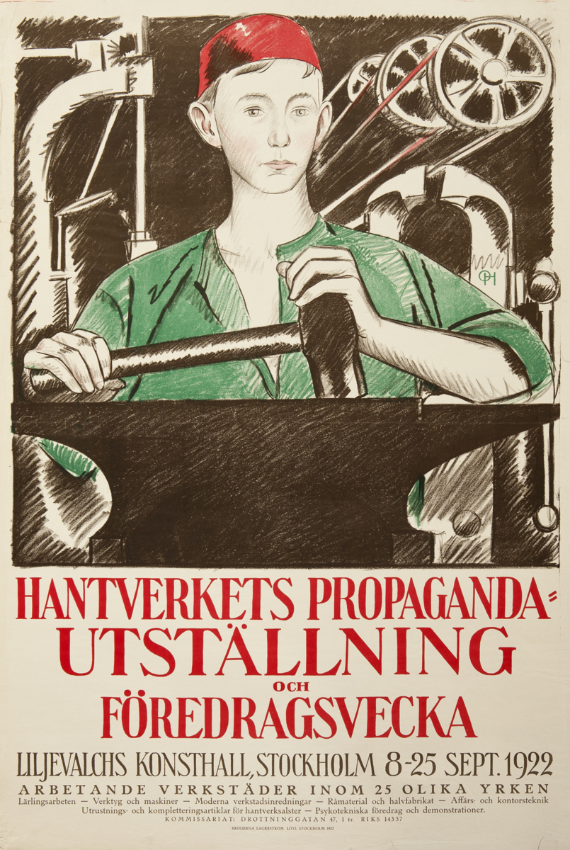 Tillbaka till sökningLägg till i min samlingSkriv utKopiera länkHelbild © Olle Hjortzberg/BUS 2014FöremålAffischHantverkets propagandautställning och föredragsvecka. Liljevalchs Konsthall, Stockholm 8-25 sept. 1922. Arbetande verkstäder inom 25 olika yrken.Olle Hjortzberg (1872 - 1959) Bröderna Lagerströms LitoTryck på papper89,00 x 60,00 cmStockholm, 1922RKM 36:41-1955Verket är inte utställt