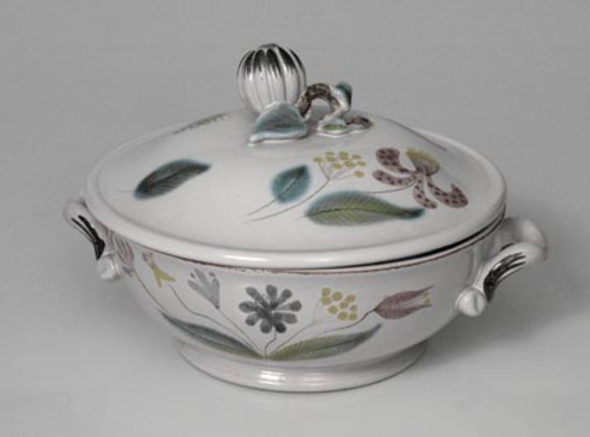 Karott med lock av fajans med polykromt måleri. Enligt uppgift har Wilhelm Kåge formgivit modellen medan Stig Lindberg gjort dekoren.