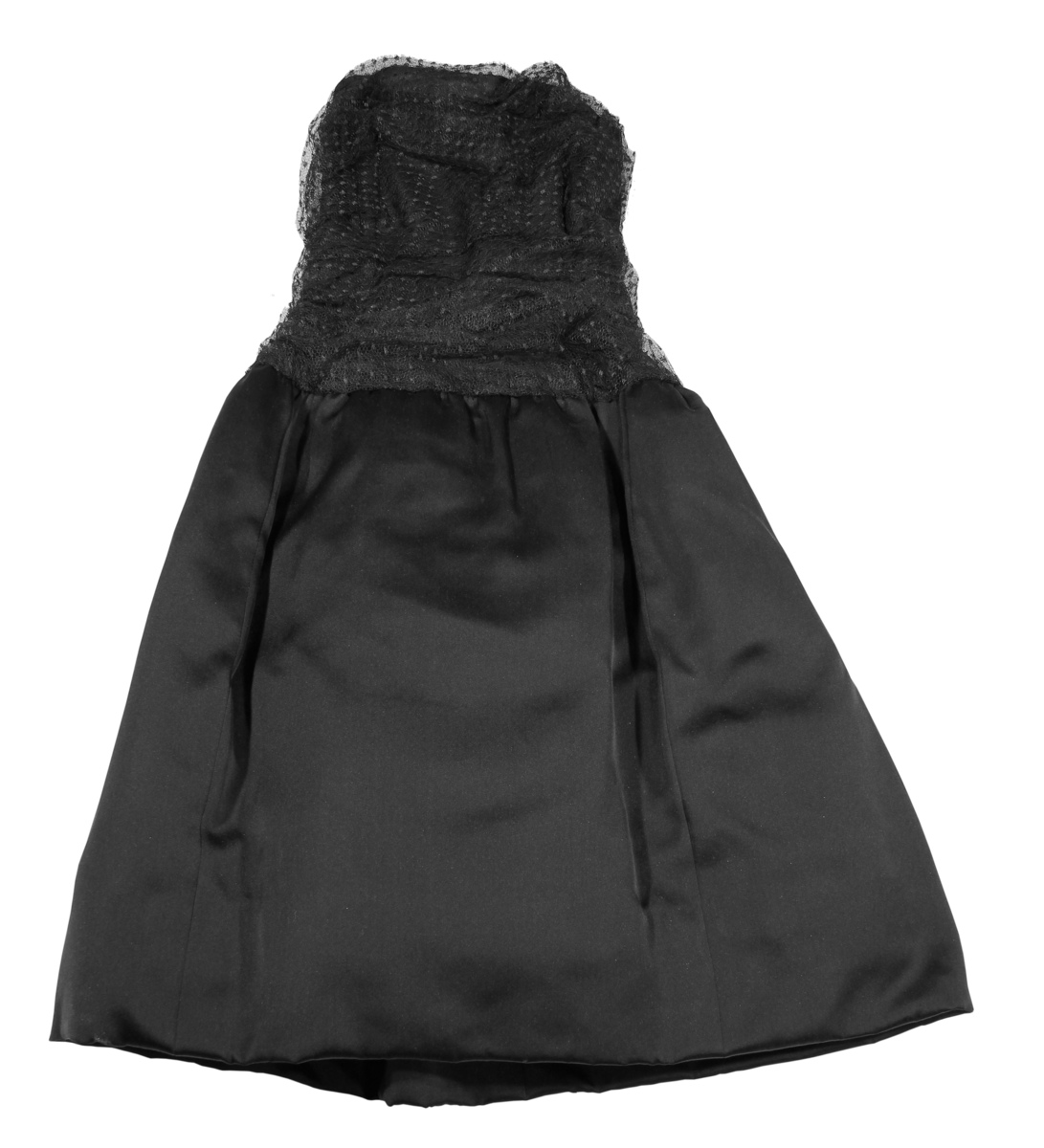 Cocktailklänning med svart, axelbandslöst korsettliv med draperad prickig tyll mot svart botten. Utställd kjol i dubblerat siden i våder. Stärkta tyllunderkjolar i flera lager.