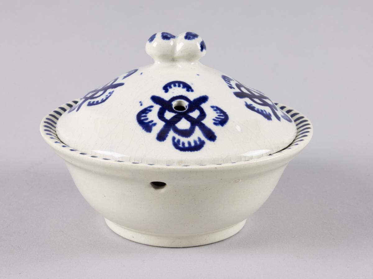 Tvättservisen Reklam är tillverkad av vitt flintgods med enkel men kraftfull dekor i ultramarin. Museet har samlat in en handkanna, tvättfat, potta, mugg och tvålkopp med lock och avrinningsskiva med hål.
