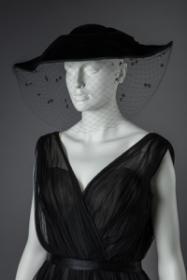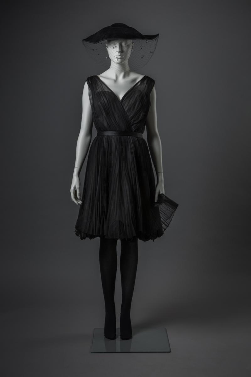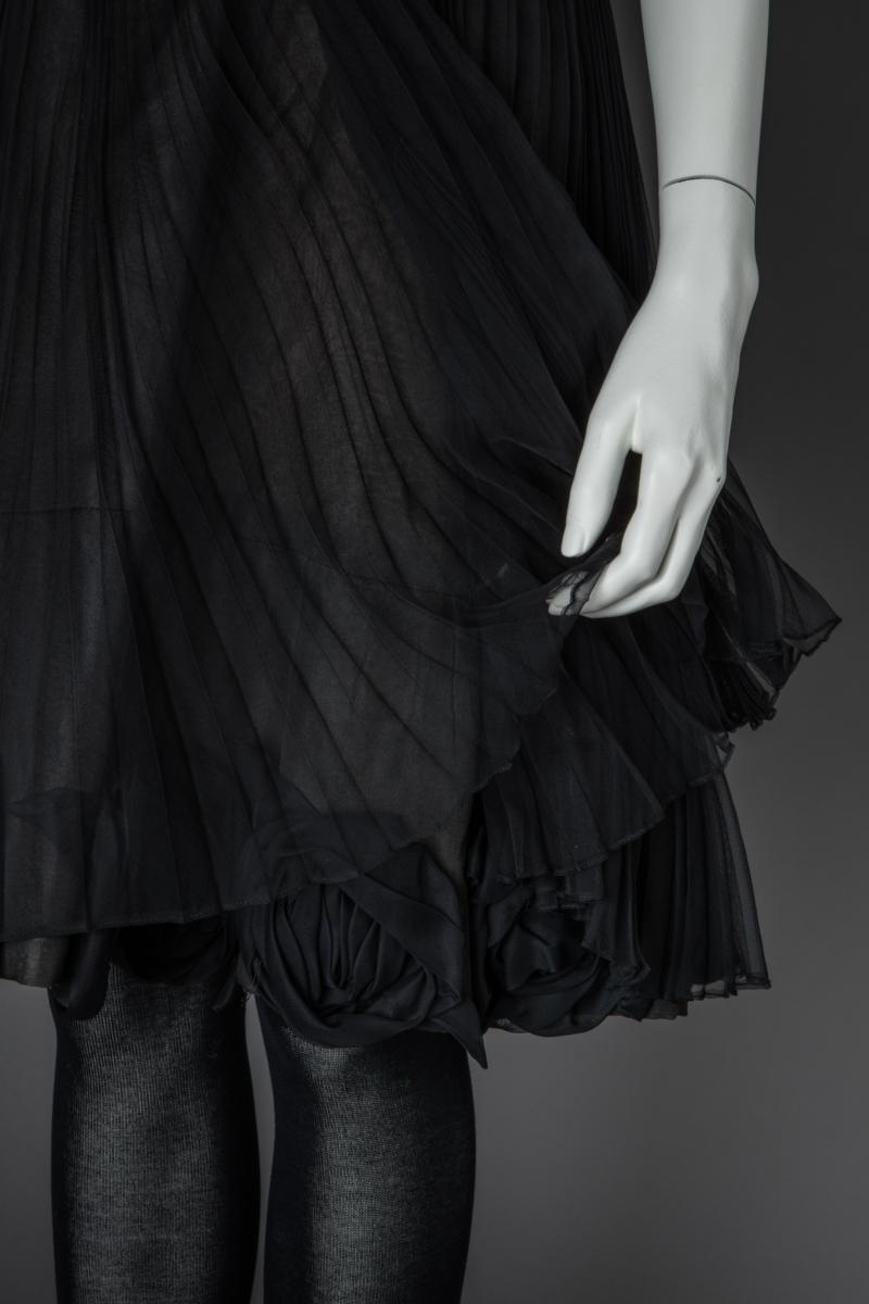 Festklänning i svart siden och plisserad chiffong. Klänningen har en rosa underkjol och svarta tygrosor.