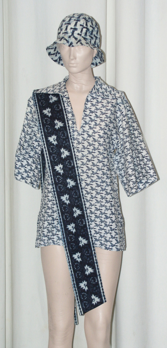 Kortärmad skjorta med snibbkrage och sprund i halsen mitt fram. Tyget är i vit bomull med tryckt mönster i blått av flygande fåglar. Ett fram- och ett bakstycke med sömmar i sidorna och slitsar i sidornas nederkant. Ärmarna är raka och korta. Tillhörande solhatt med hög kulle skuren i sex trianglar. Tyget är vit bomull med tryck i blått av kvastkärvar. Brättet utgörs av en dubblerad kant som är förstärkt med längsgående sömmar. Långsmalt rektangulär sjal eller skärp i dubblerad bomullstextil i vitt med dominerande blått tryck av bl.a. blommor.