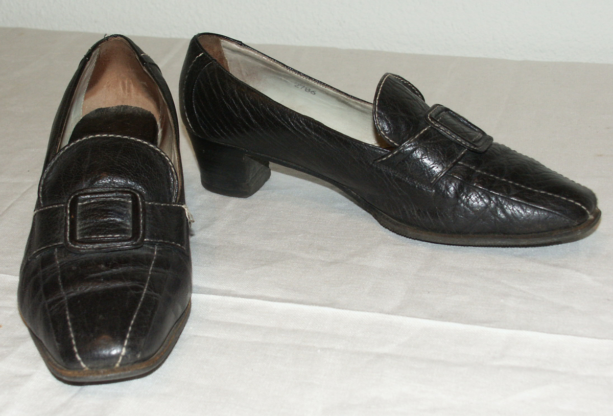 Promenadsko i svart läder utan snörning och med liten klack. Skon har dekorativa vita sömmar på ovanlädret och hälkappan. På ovanlädret sitter en slejf som går över skon med ett fyrkantigt låtsasspänne i svart läder. Innersula i svart läder och foder i grått läder. Sulan är räfflad under framfoten och sulan är stämplad med st. 4½.