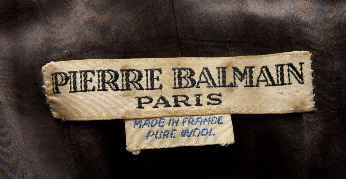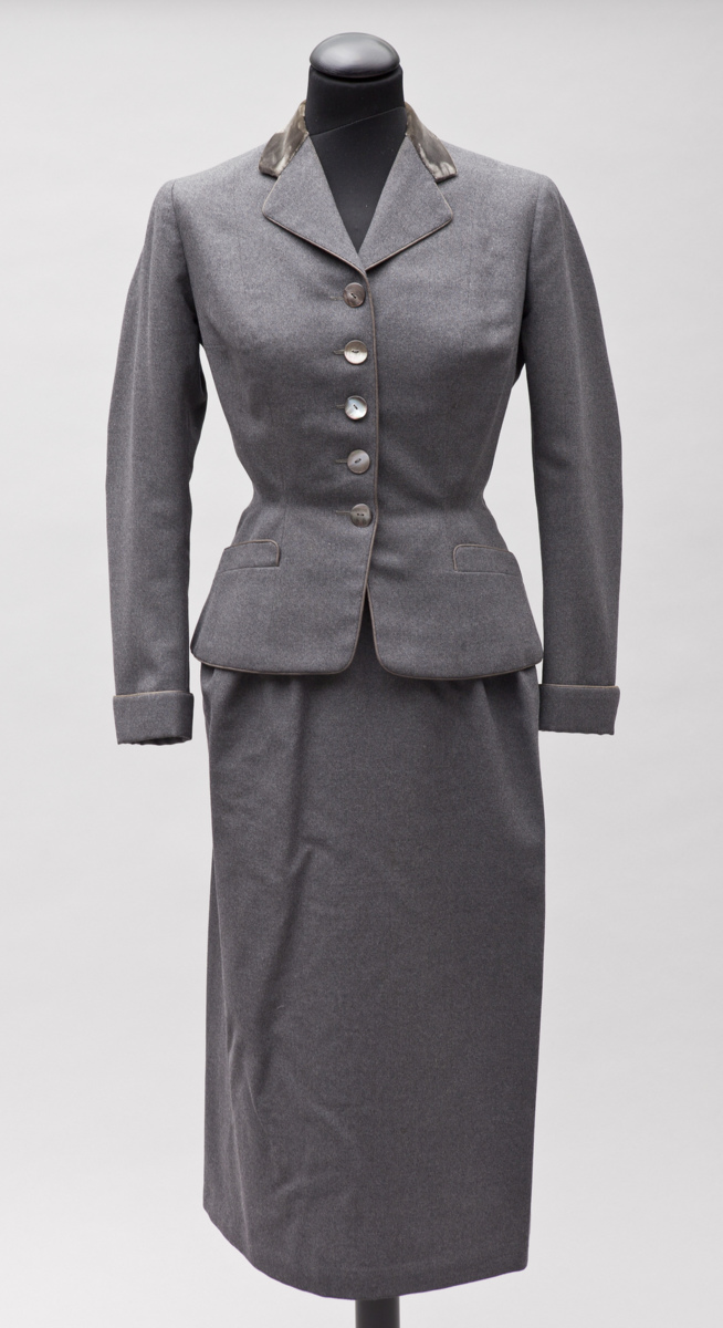 Figursydd kavaj med tydligt insvängd midja och markerade axlar. Bakstycket har två sprund i nederkanten. Kavajen har krage med slag där kragen är klädd med grå sammet. Kavajen knäpps mitt fram med 5 pärlemorknappar i grått. Kavajen har två stolpfickor med ca 2,5 cm bred stolpe på framstyckets sidor. Kavajens ytterkanter samt fickornas stolpar har passpoaler i gröngrått. Längden mitt bak är 55,5 cm. Kjolen är snäv och rak och slutar ca 15cm nedanför knäet. Kjolen är sydd i två våder varav bakstycket är mycket smalare än framstycket. I var söm i nederkant finns ett ca 10 cm långt gångveck. Kjolen knäpps i midjan med dragkedja placerad i kjolens ena sidosöm. Kjolens längd är 77cm.