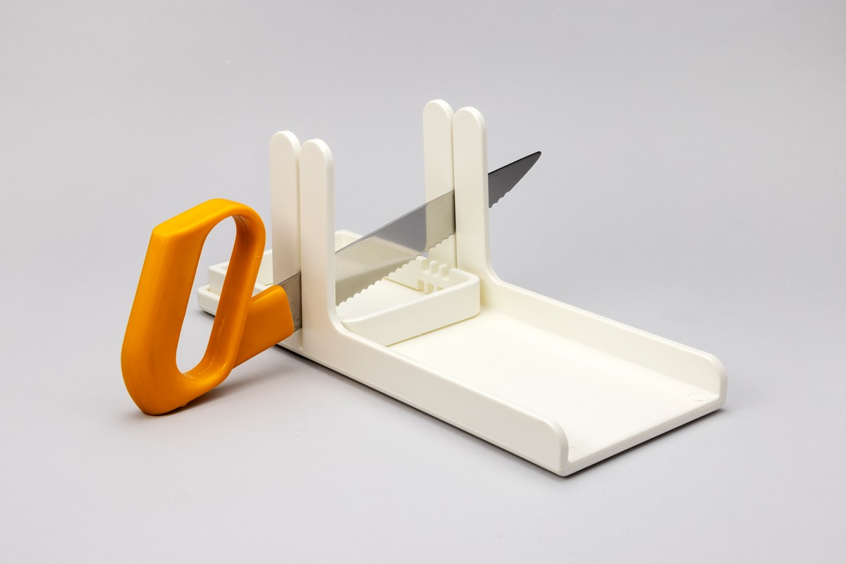 Brödkniv med ställning. Tillverkades urprungligen av AB Gustavsbergs fabriker. Detta ex från 1999.