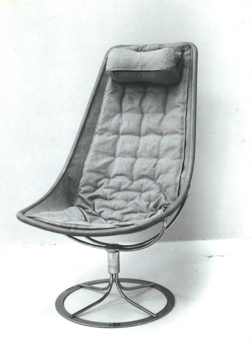 Fåtölj av hampduk på stålrörsram och vridbart stålrörsstativ. Formgiven 1965.