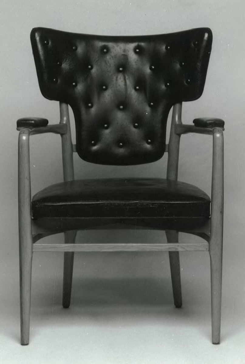 Tillbaka till sökningLägg till i min samlingSkriv utKopiera länkBild från katalogkort © Carl-Axel Acking/BUS 2014FöremålKarmstolCarl-Axel Acking (1910 - 2001) Erik Gunnar Asplund (1885 - 1940) Ferd. Lundquist & Co (1864 - 1967)Stomme av hickory, skinnklädsel.1935RKM 168-1985Gåva av Göteborgs fastighetskontorVerket är inte utställtBeskrivningOrdförandestol ritad 1935 för sessionsal i Göteborgs rådhus. Litteraturbild s. 200-201