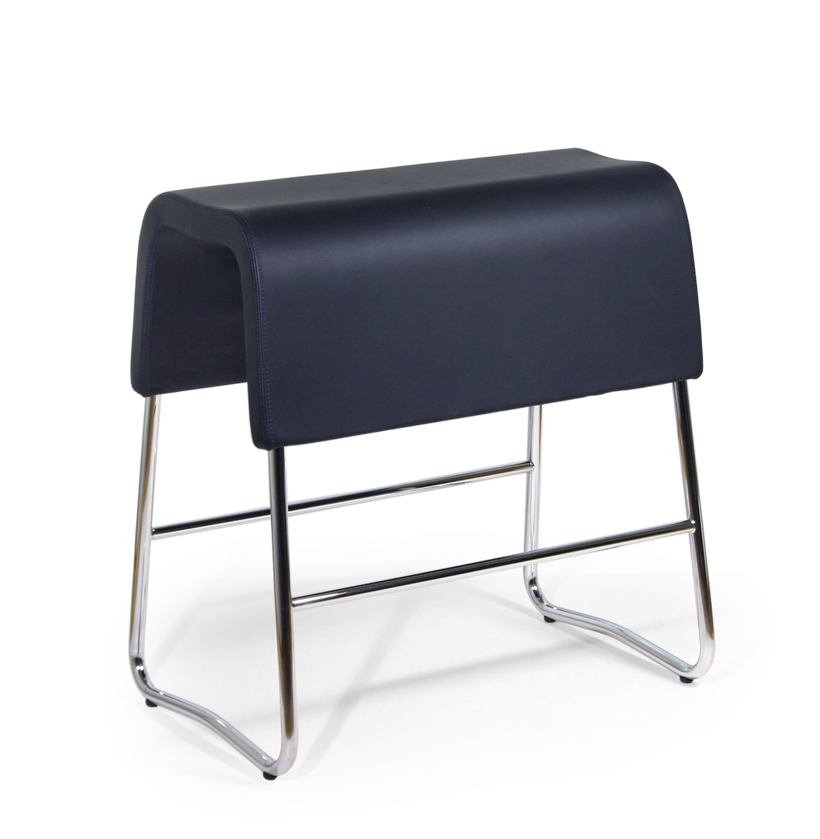 Bänk, stativ av stålrör, sits av formpressad björk med stoppning av formgjuten kallskum. Svart skinnklädsel.