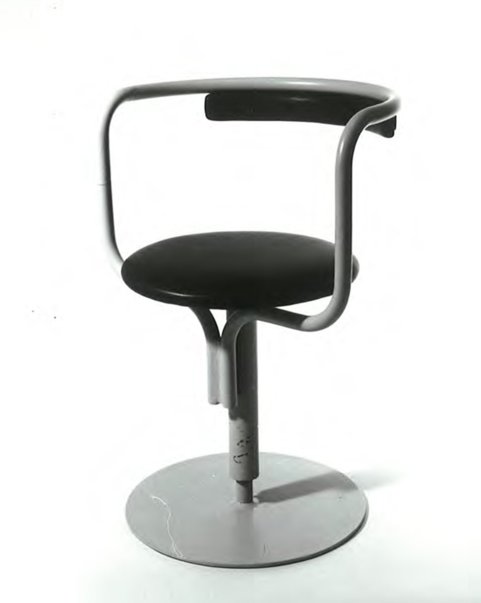 Snurrstol med höj- och sänkbar sitthöjd. Ram av stål målat i mintgrön. Sitsen av läder är mörkgrön. Stolen är ursprungligen ritad för Skattkammaren på Stockholms slott men då i svart.