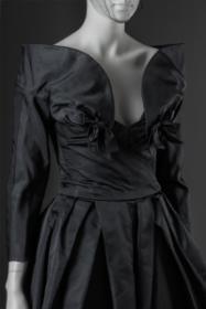 Aftonklänning i tjockt svart faille-siden med 3/4-ärm och djup urringning. Klänningen har en inbyggd korsett som knäpps i ryggen samt en volangkjol i stärkt tyll i sex volangvåder. Livet ligger omlott över bysten. Urringningen är vid med en bågformad krage/kant med två knutna svarta rosetter på var sida. Kragen fortsätter på bakstycket och bildar där en rak uppstående bred krage. Klänningens kjol är ca 10cm längre bak än fram med breda lagda veck runt hela midjan. Ärmarna är raka och smala med trekantiga iläggningar under armarna. Klänningen knäpps med dragkedja i sömmen mitt bak. Dragkedjan går inte hela vägen upp i ryggen utan lämnar en ca 9cm bred glipa vid urringningens kant.