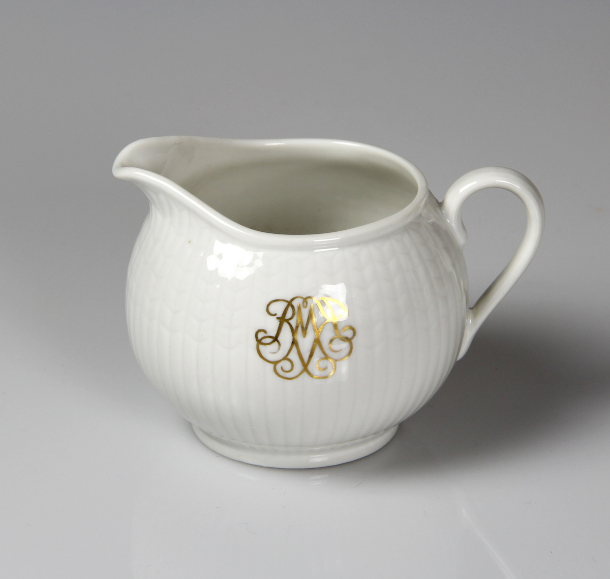 Tillbaka till sökningLägg till i min samlingSkriv utKopiera länkHelbildFöremålGräddkannaLidköpings porslinsfabrik (1911 - 1943)Porslin7,40 cmLidköpingRKM 39-1996Verket är inte utställtBeskrivningGräddkanna av porslin med ax-mönster och Röhsska Museets spegelmonogram i guld.