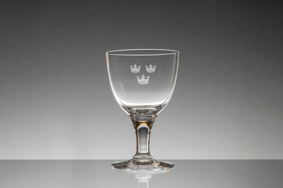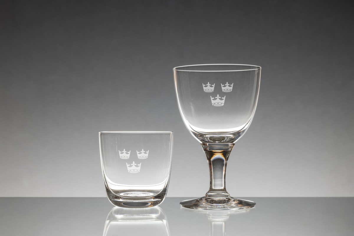 Del av glasservis formgiven för Utrikesdepartementet. Ingaverat tre kronor.