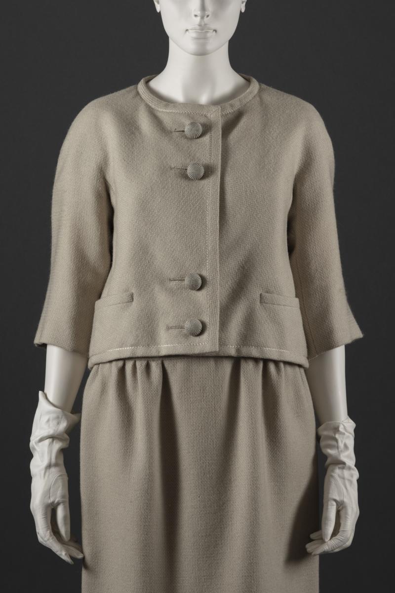 Enkel jacka med trekvartsärm, rundad hals och öppning mitt fram. Ytterkanterna är markerade med broderad linje av blankt garn och jackan är helfodrad med gulvitt siden. Kjolen är kort och snäv med ett helt framstycke och två bakstycken. Fodrad med vit organza förutom linningen som är fodrad med gulvitt sidentyg.
