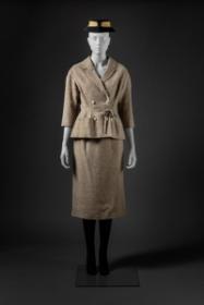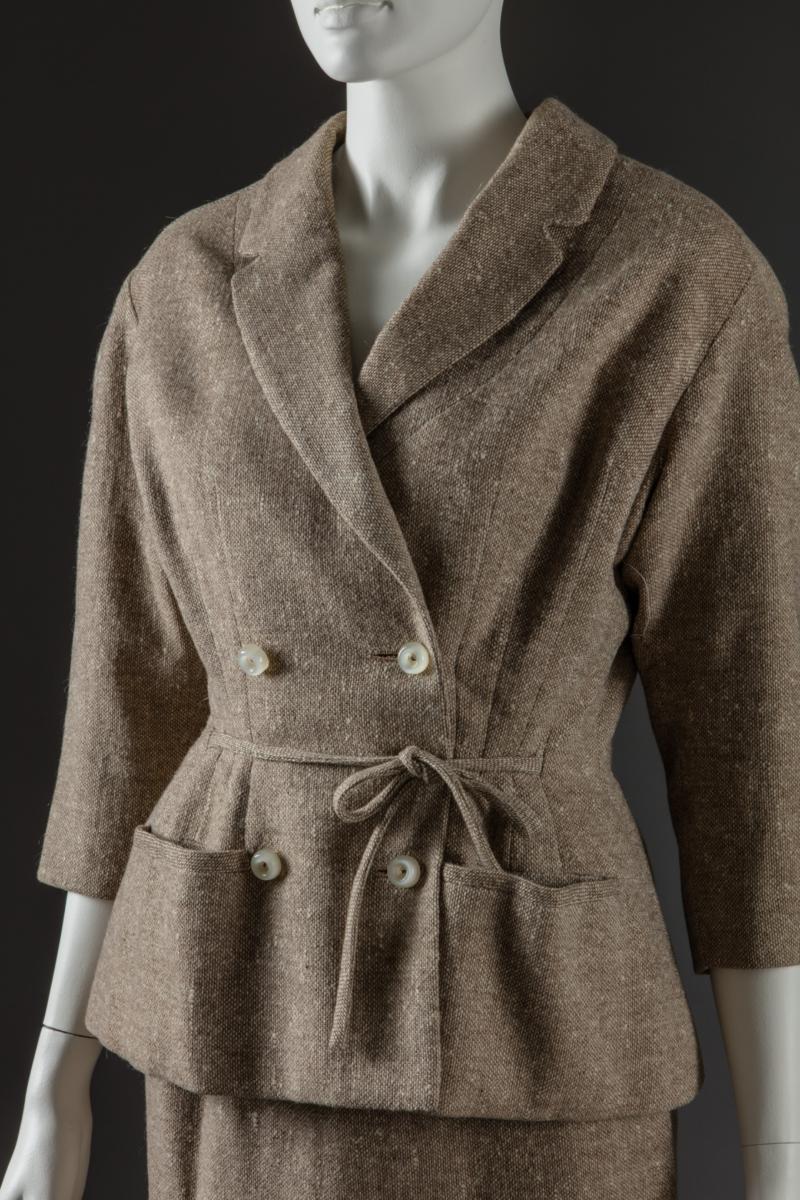 Dubbelknäppt jacka med krage, markerad midja och 3/4 ärm. Snäv kjol i två våder varav den ena är bredare och täcker framstycket och en del av baksidan med en sidosöm och söm mitt bak. Kjolen är fodrad med gräddvitt siden.