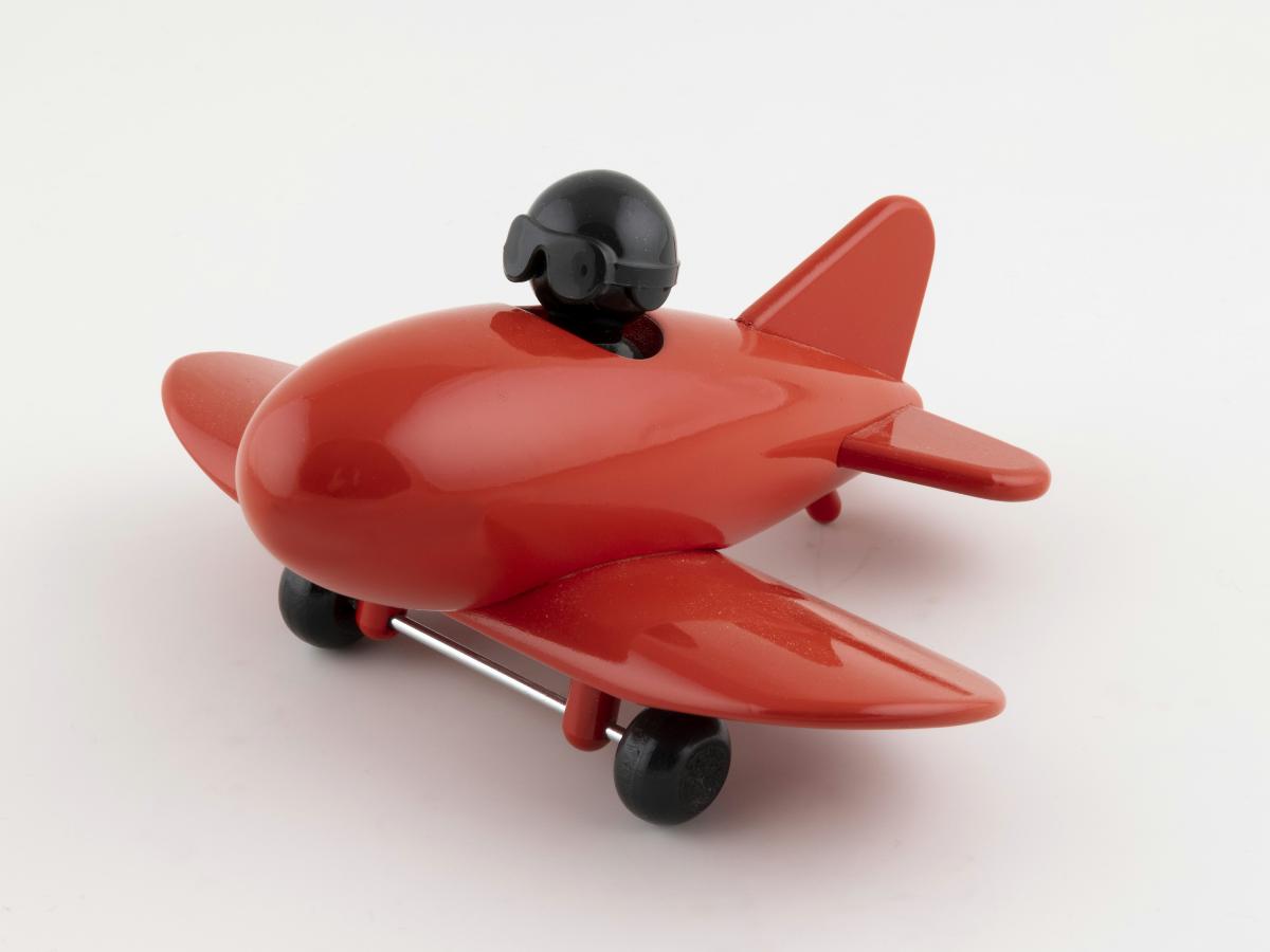 Leksak i form av ett rött flygplan, jetliner. Hjulen och den lösa piloten är svarta.