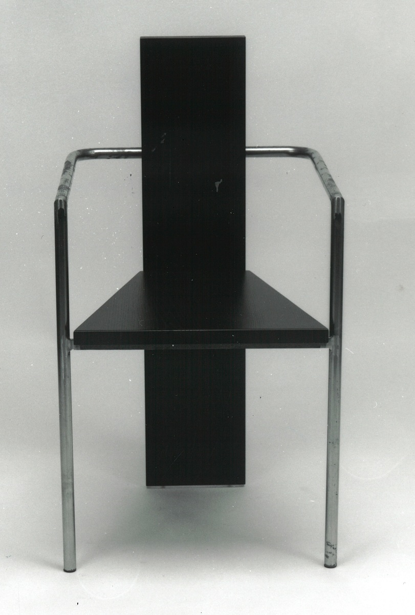 Stol med sits och rygg av lackerad ask, ryggen fungerar även som bakre ben. Armstöd och främre ben av stålrör. Finns också i en variant med betong.