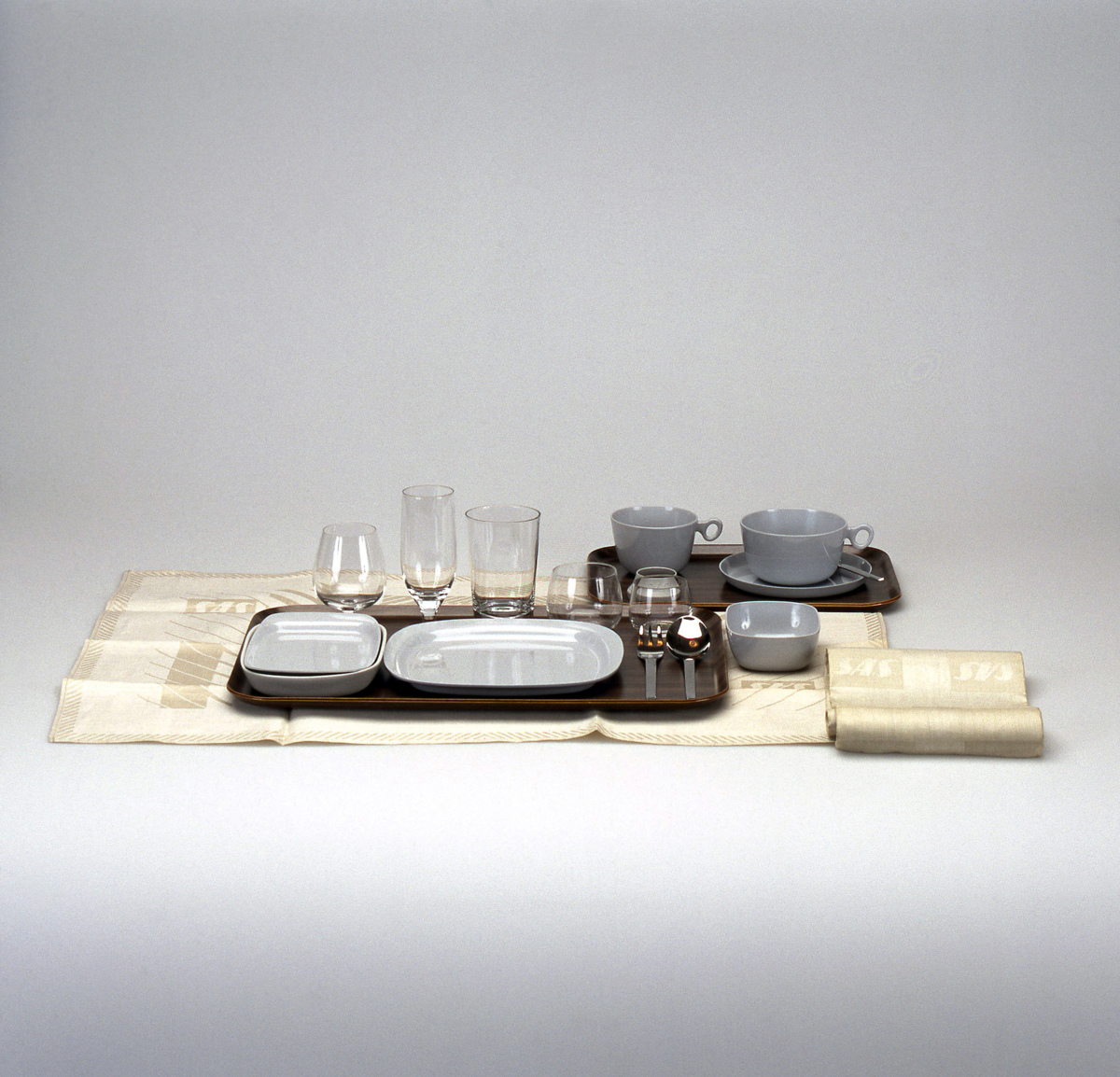 Servisdelar för SAS, formgivna av Sigurd persson, duk och servett formgivna av Kaisa Melanton.