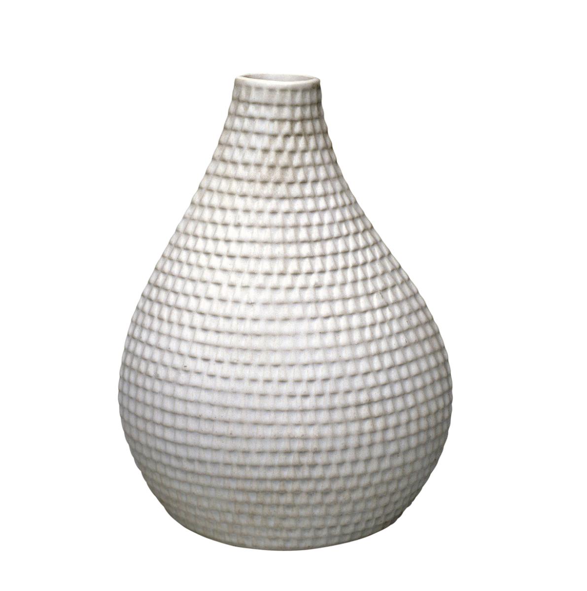 Vas av porslin med genomskinlig halvmatt glasyr över ett i godset pressat mönster. Hoptryckt och något assymetrisk form.