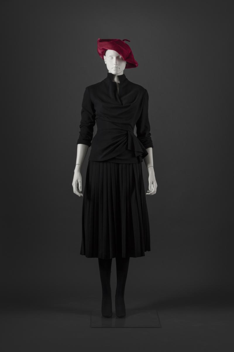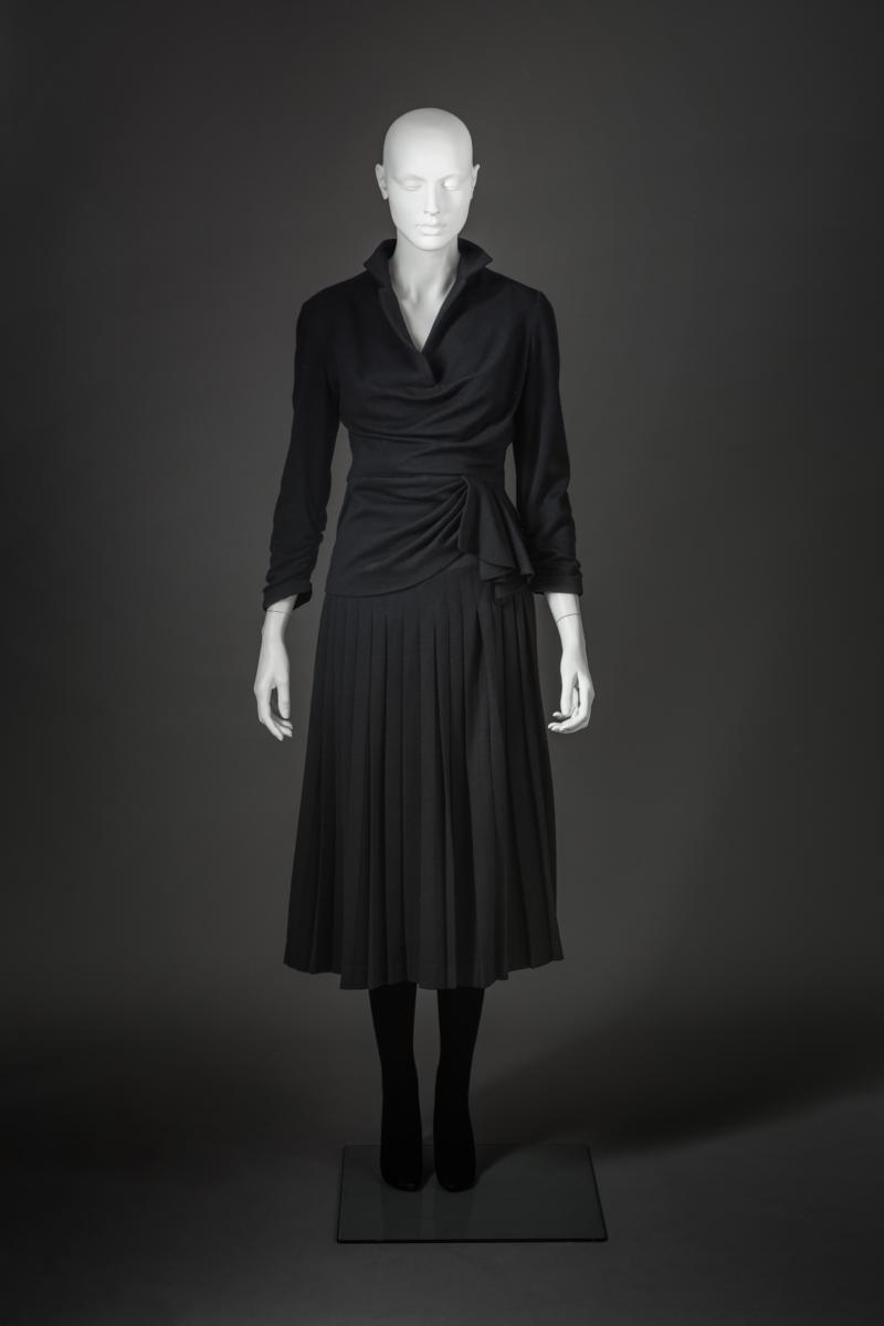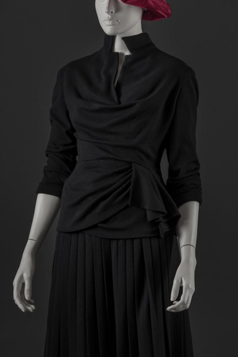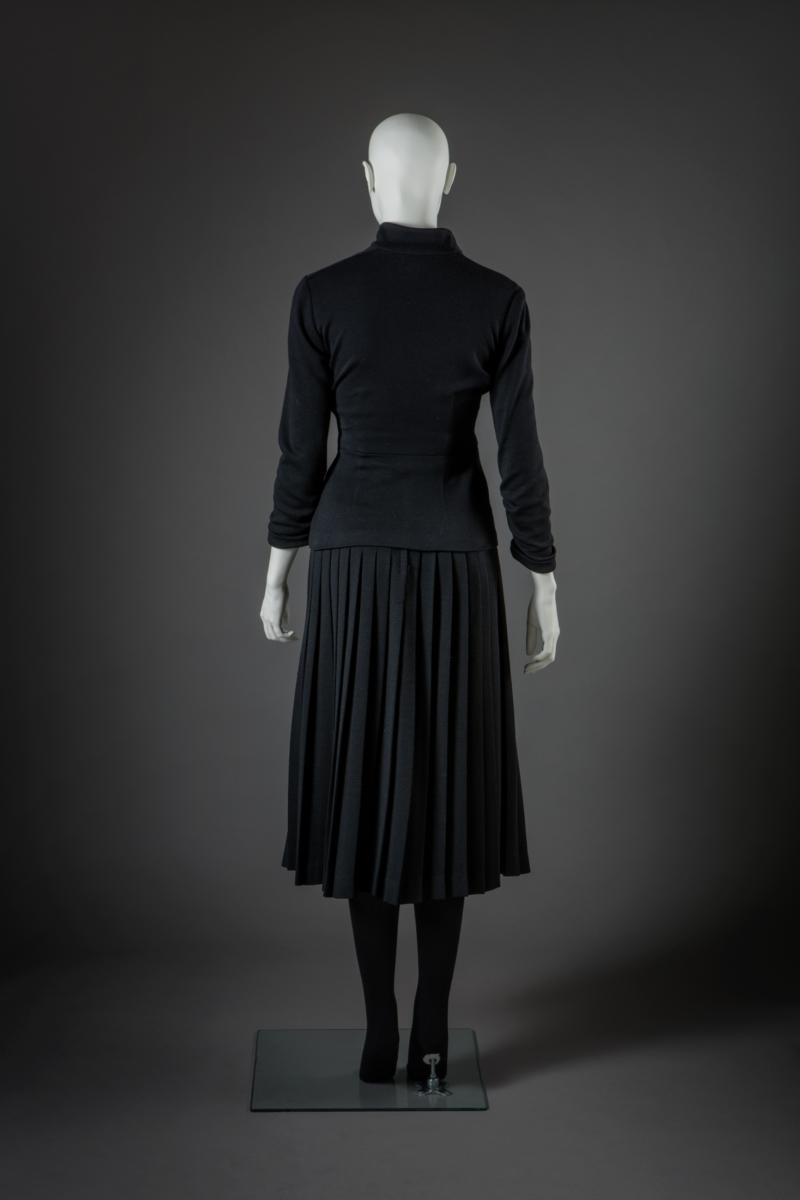 Tvådelad klänning i svart ofodrad ulljersey. Enligt tidigare ägare är detta ett original från Christian Dior hösten 1947 eller senast 1948. Välskuren men nonchalant genom sin uppfällda krage, sina uppkavlade ärmar och sitt löst knutna skärp till vadlång veckad kjol vilka ska föra tanken till en avspänt buren skjortklänning.
