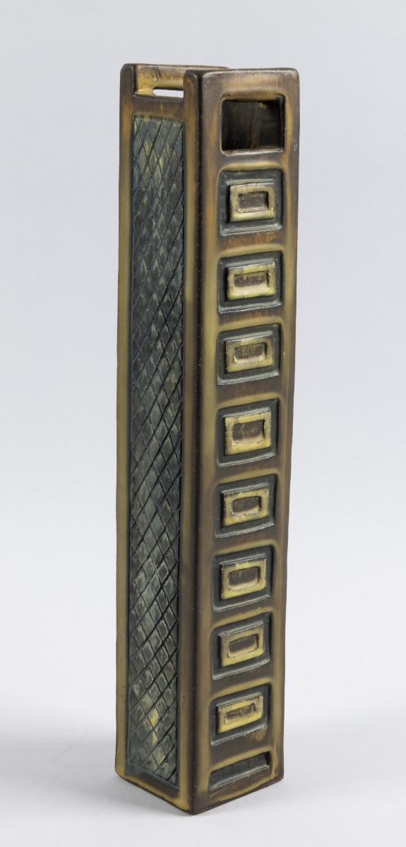 Tillbaka till sökningLägg till i min samlingSkriv utKopiera länk© Wilhelm Kåge/BUS 2014FöremålVasWilhelm Kåge (1889 - 1960) Gustavsbergs porslinsfabrik (*1827)41,10 x 7,20 cmFarsta1953RKM 28-1953Inköpt 1953 från tillverkarenVerket är inte utställtBeskrivningVas av glaserat stengods i nyanser av gult, brunt och grönt. "Farstagods".