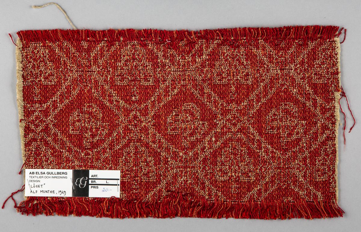 Tillbaka till sökningLägg till i min samlingSkriv utKopiera länk© Alf MuntheFöremålTygprovLövetAlf Munthe (1892 - 1971) Elsa Gullberg Textilier och Inredning AB (*1927)Tuskaftväv0,30 x 20,50 x 35,00 cmSverige, 1929RKM 48-2004InköptVerket är inte utställtLitteraturAlf Munthe. Den mjuka arkitekturens mästare, red., Gidlunds Förlag Leksands konstsällskap, Möklinta, 2020.