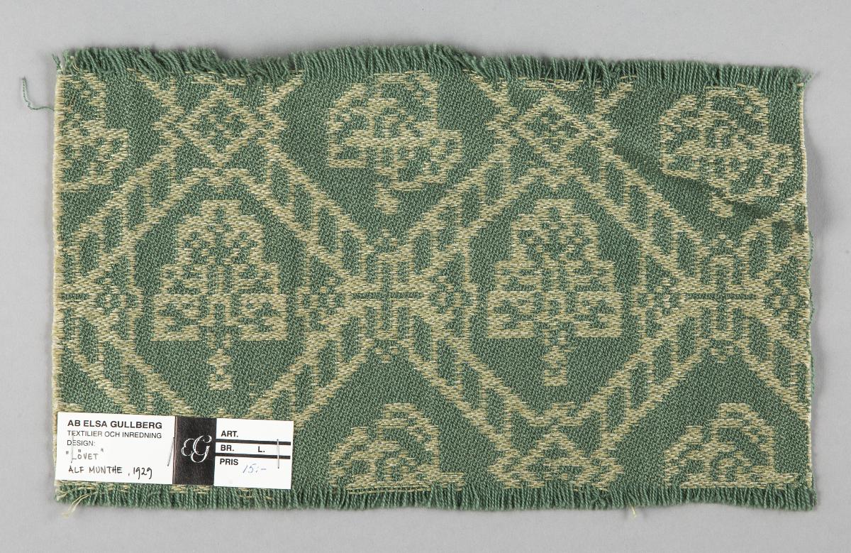 Tillbaka till sökningLägg till i min samlingSkriv utKopiera länk© Alf MuntheFöremålTygprovLövetAlf Munthe (1892 - 1971) Elsa Gullberg Textilier och Inredning AB (*1927)0,30 x 20,00 x 32,50 cmSverige, 1929RKM 72-2004InköptVerket är inte utställtLitteraturAlf Munthe. Den mjuka arkitekturens mästare, red., Gidlunds Förlag Leksands konstsällskap, Möklinta, 2020.