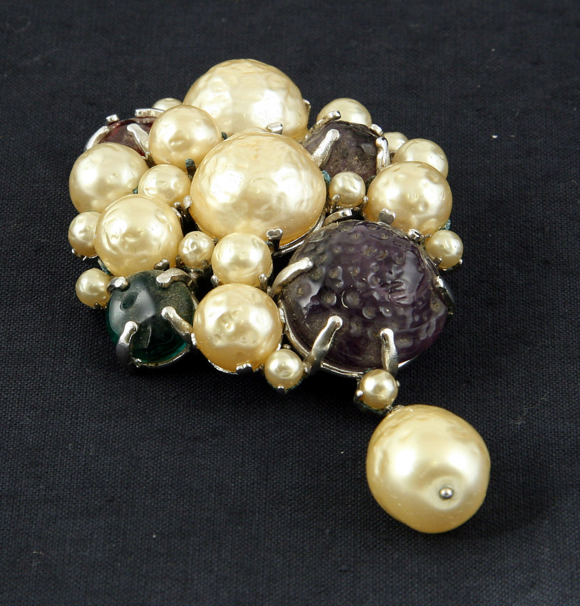 Brosch med pärlfärgade, lila, gröna och röda kulor. Smycket gjordes i en liten exklusiv upplaga.