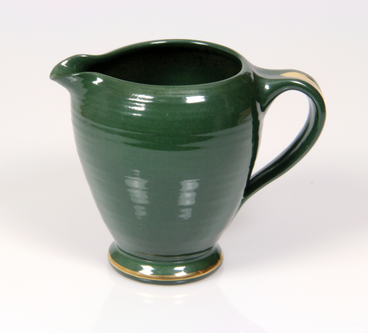 Kanna av ljust stengods glaserad ut och invändigt med mörkgrön glasyr, gulddekorationer. Kannans form är inspirerad av en empirkanna och utförd för Nationalsmuseums utställning "Empiren i Sverige" oktober 1991 - mars 1992.