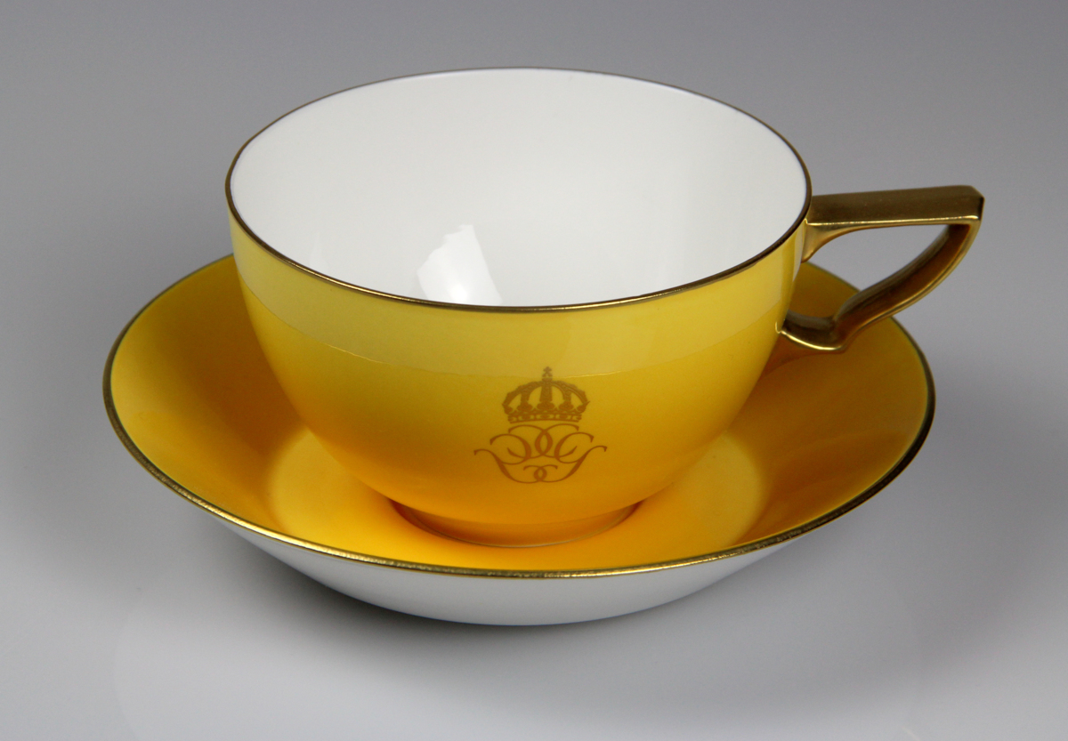 Tekopp och fat av benporslin. Dekor i form av kung Carl Gustavs spegelmonogram under krona.Tillverkat av Rörstrand på Gustavsberg.