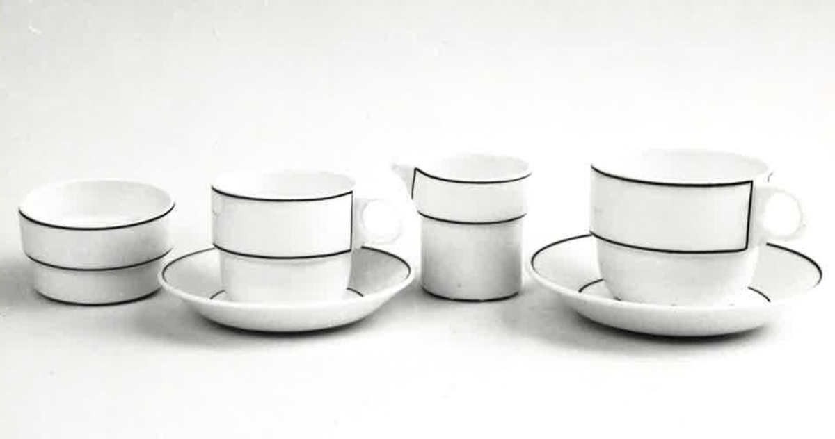 Servis av benporslin dekorerad med en smal brun linje. Vissa delar är stapelbara.