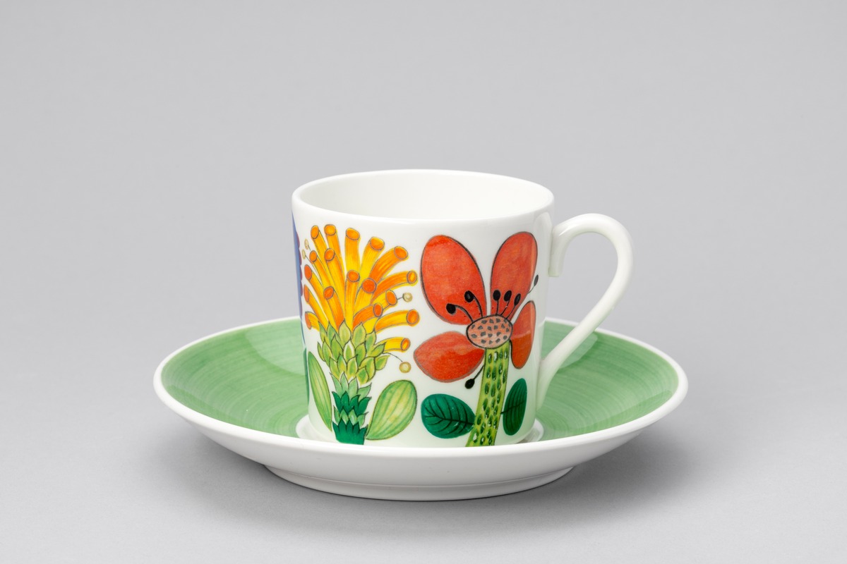 Två kaffekoppar ur serien "Tahiti". Modellen "SA" kom första gången 1959 men har här anpassats för maskindisk och försetts med små fötter. Servisen är tillverkad av vitt benporslin och dekorerad med mönstret "Tahiti", stiliserade blommor i flera färger. Faten har grönt bräm.
