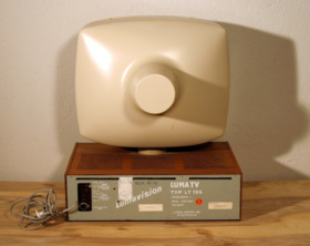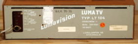 Ljusgrå TV, snurrbar på underrede av teak. Svartvit bild med 18 tums bildrör. Glödlamps- och elektronikföretaget Luma ingick liksom Gustavsberg i KF-koncernen och i slutet av 1950-talet knöts Stig Lindberg till Luma som formgivare av ett par tv-modeller. Hans Lumavision skiljde ut sig från marknadens övriga utbud. Skärm och bildrör placerade han som en vridbar, organiskt formad enhet ovanpå en rektangulär träfanerad låda som var avsedd att stå på ett bord eller en hylla. Många andra tv-apparater vid denna tid var golvmodeller som i sin utformning påminde om skåp eller radiogrammofoner.