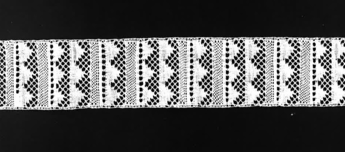 Spetsprov, knypplad med 28 par pinnar av Per Ola Skoglund, Borås. Spetsen knypplad med nålbotten med vridning, vävbotten och nätbotten.