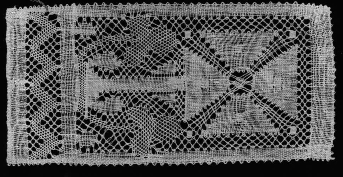 Knypplad av oblekt lingarn nr 100/2. I spetsen ingår rutbotten, vävbotten, nätbotten och mandlar. Påbörjas och avslutas med hel kant. Knypplad med 59 par pinnar. De två par som ska användas till mandeln, läggs åt sidan tills vävbotten är färdig så långt att mandeln får plats. De knytes med de två paren som därefter återgår till vävbotten. Knypplad av Per Ola Skoglund i Borås.