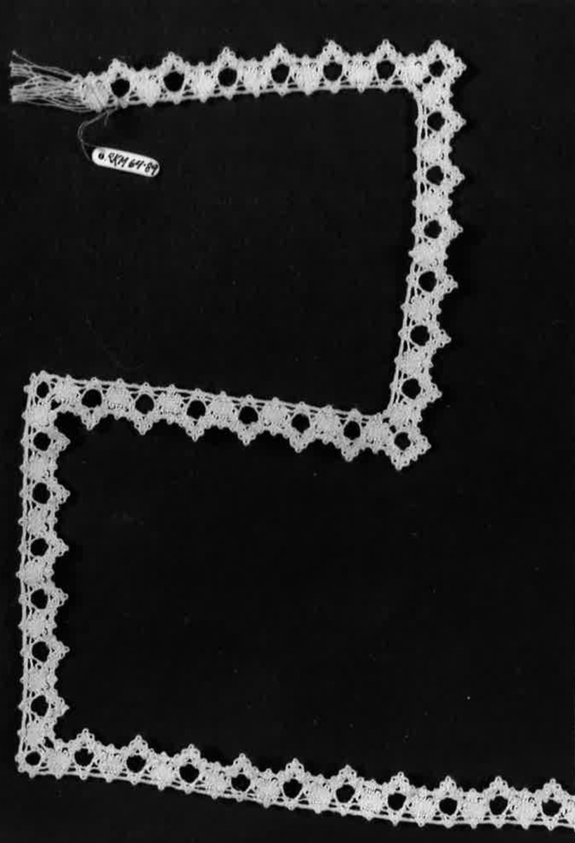 Knypplad av oblekt lingarn nr 50/3, vävbotten och flätor, 15 par pinnar, med fyra hörn. Knypplad av Per Ola Skoglund i Borås.