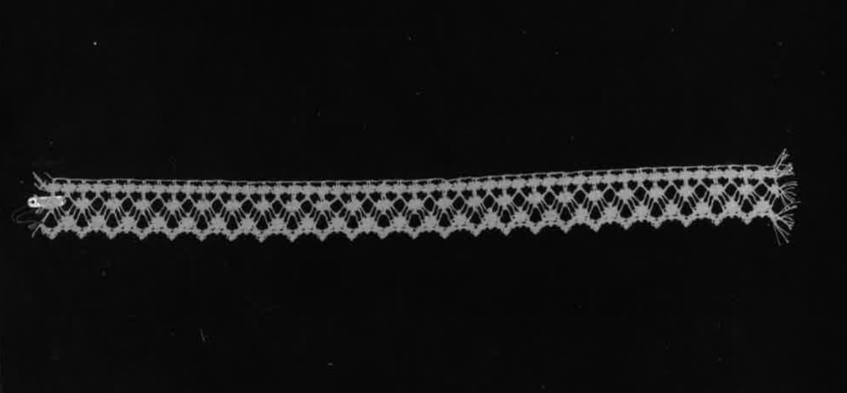 Knypplad av oblekt lingarn nr 50/3, vävbotten och flätor, 9 par pinnar. Knypplad av Per Ola Skoglund i Borås.