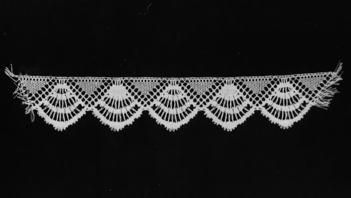 Knypplad av halvblekt lingarn nr 20/3 med 23 par pinnar. I spetsen ingår vävbotten, nätbotten och flätor. Knypplad av Per Ola Skoglund i Borås.