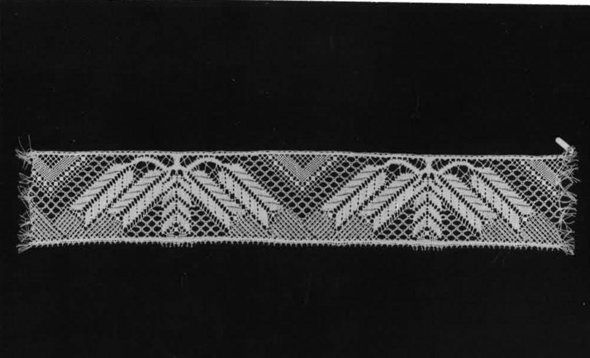 Knypplad av halvblekt lingarn nr 40/3 med 42 par pinnar, nr 25/3 med 1 pinne med 2 trådar. I spetsen ingår nålbotten med vridning, brabantbotten, vävbotten, nätbotten, mandlar, kastudd och konturtråd. Komponerad 1937 och omarbetetad 1938. Knypplad av Per Ola Skoglund i Borås.
