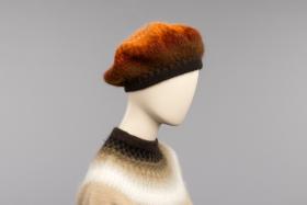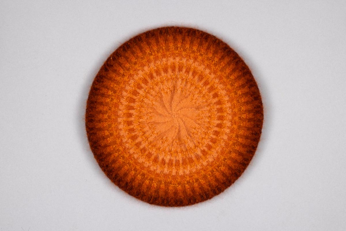 Barett "Turmalinen" Mönster i avigt och rätt, resårkant. Orangea och bruna toner.