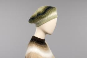 Barett "Kokospalm", handstickad i angora och Eja-garn. Slätstickning, mönster i avigt och rätt, resårkant. Grågröna toner, grått och vitt.