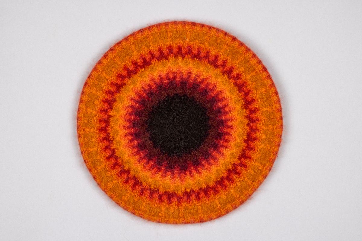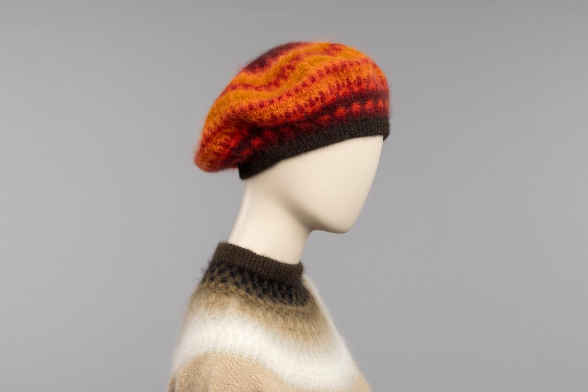 Barett "Flamman", handstickad i angora och Eja-garn. Orange, röda toner, mörkbrunt upptill och i resårkanten.
