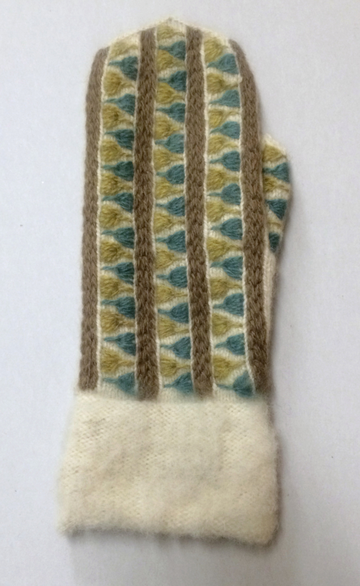 Handstickad tumvante i ullgarn. Slätstickad i vitt ullgarn med broderat mönster i grått, gulgrått, blågrönt på översidan och tummen.Rätstickad, uppruggad krage. Märkt på sidenband: "Prov".