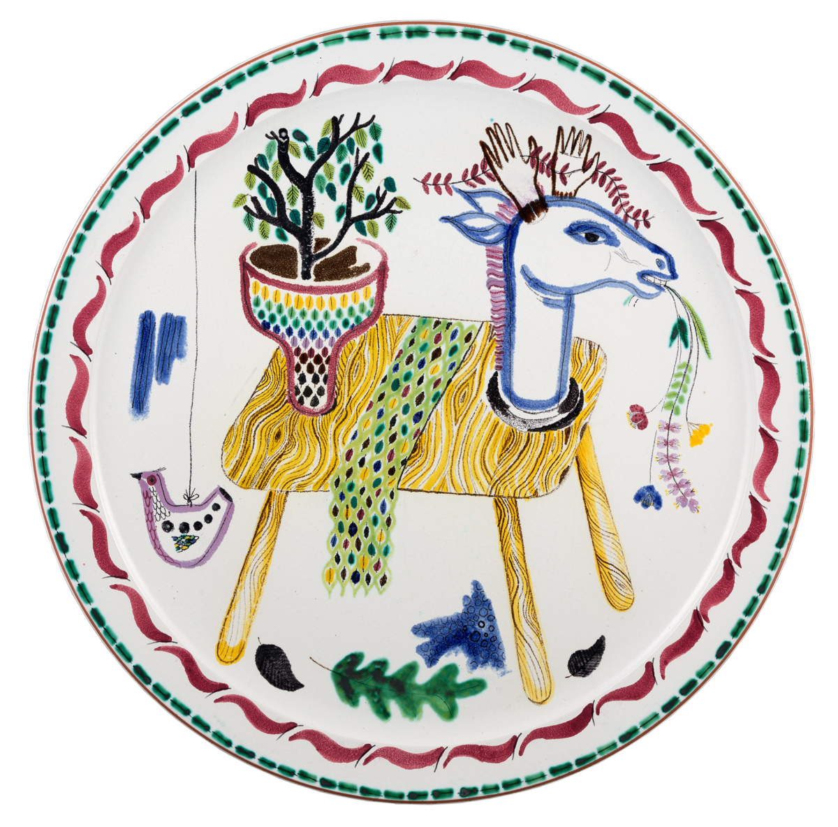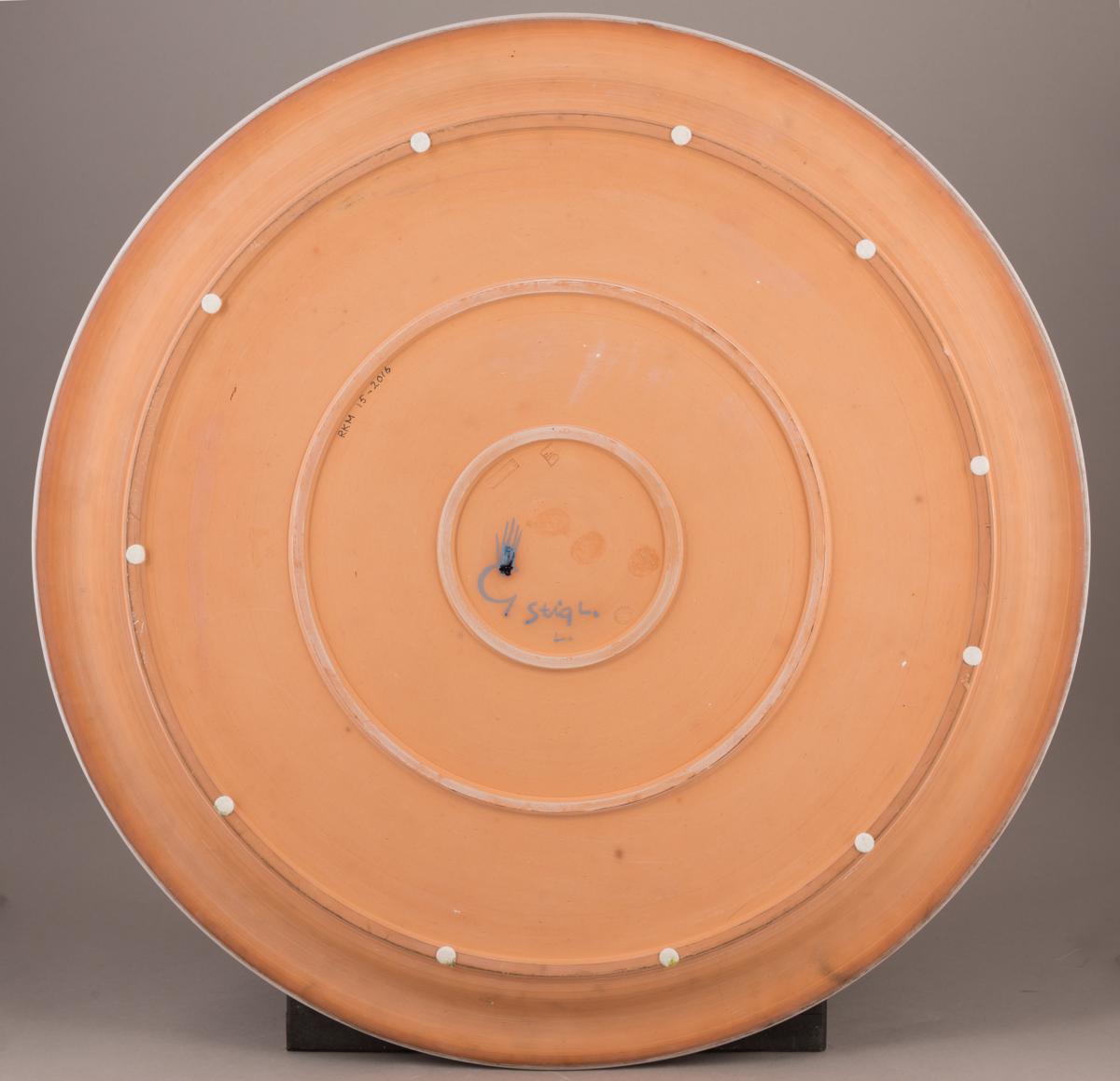 Stig Lindberg debuterade med stengods i en grupputställning 1941, men det egentliga genombrottet kom året därpå med utställningen Fajanser målade i vår i Gustavsbergs visningslokal i Stockholm. Utställningen presenterade pjäser av Stig Lindberg och hans äldre kollega och mentor Wilhelm Kåge. En ny grupp föremål av samma slag visades också på Röhsska museet året därpå under titeln Fajanser från Gustavsbergs Studio. Röhsska museets intendent Gustaf Munthe skrev i tidskriften Form efter utställningen mycket uppskattande om Stig Lindbergs ”målarglädje och fabuleringslusta”. Detta stora, unika fat, ingick i utställningen 1943. Fatet har motiv av en pall på vilket det står en skulptur i form av ett hjorthuvud. Hjortens krona utgörs av människohänder. Pallen med sina fyra ben får spela rollen av hjortens kropp. Övergångarna mellan ting, djur och människa är typiska för Stig Lindbergs motivkrets vid denna tid och visar på inspiration från surrealismen. Motivet av hjorten med en krona av människohänder hade Stig Lindberg använt i en stengodsskulptur redan 1939.