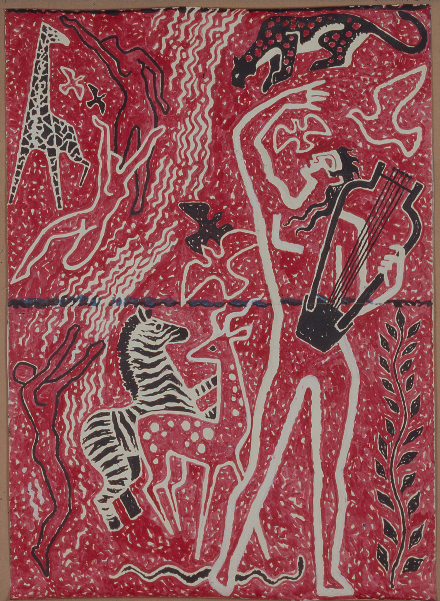 Skiss till ridå för Malmö Stadsteater. Blyerts och akvarell på papper. Röd botten med figurer i vitt och svart, blå färgfläckar. Orfeus med lyran, djur och vattenfall.