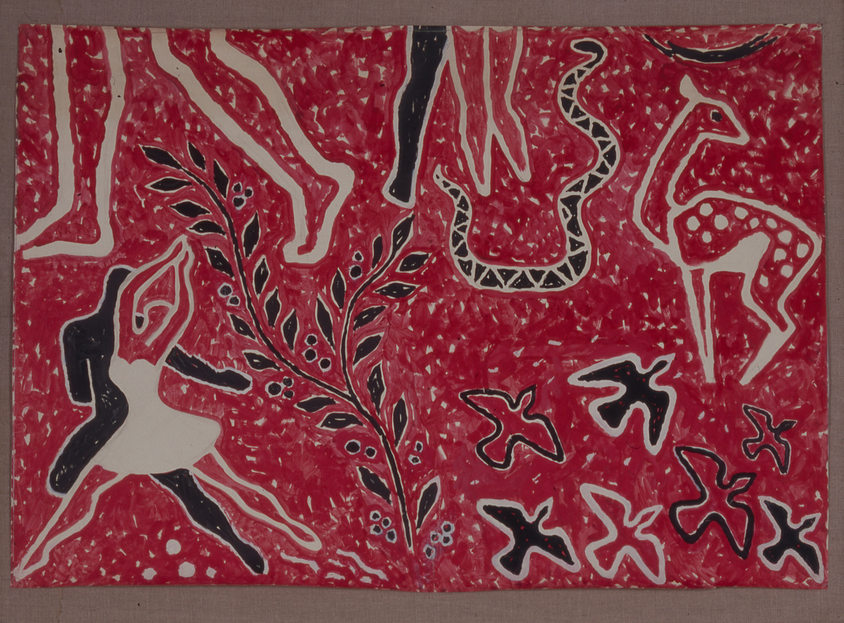 Skiss till ridå för Malmö Stadsteater. Blyerts och akvarell på papper. Röd botten med figurer i vitt och svart. Dansande par, orm, fåglar, djur.