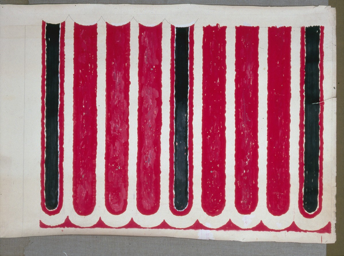 Tillbaka till sökningLägg till i min samlingSkriv utKopiera länk© Vicke Lindstrand/BUS 2014FöremålSkissVicke (Viktor Emanuel) Lindstrand (1904 - 1983) Elsa Gullberg Textilier och Inredning AB (*1927)Akvarell och blyerts på apper104,30 x 157,50 cmStockholm, 1944RKM 72-1994InköptVerket är inte utställtBeskrivningSkiss till ridå för Malmö Stadsteater. Randig, röda och vita vertikala bågar, tre fyllda med svarta fält. Övre bården av ridån.