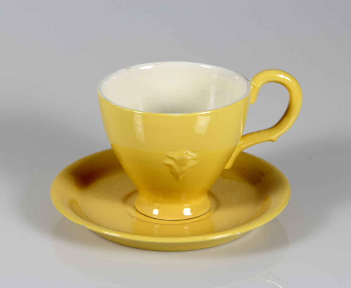 Kaffekopp och fat, av fajans med gul glasyr utvändigt och ornament i relief.