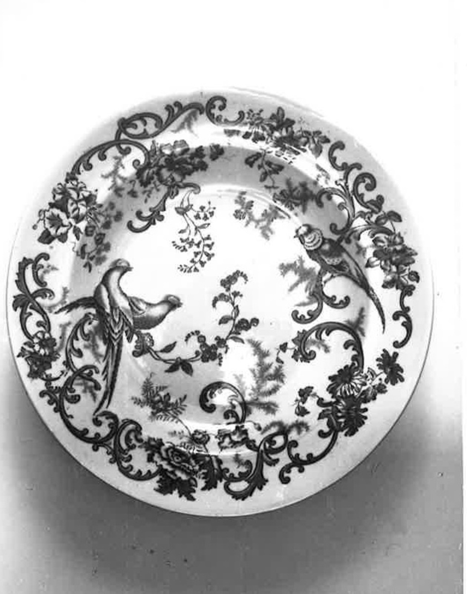 Djup tallrik i flintgods med tryckt dekor. Servisen Nanking tillverkades mellan åren 1895-1901.